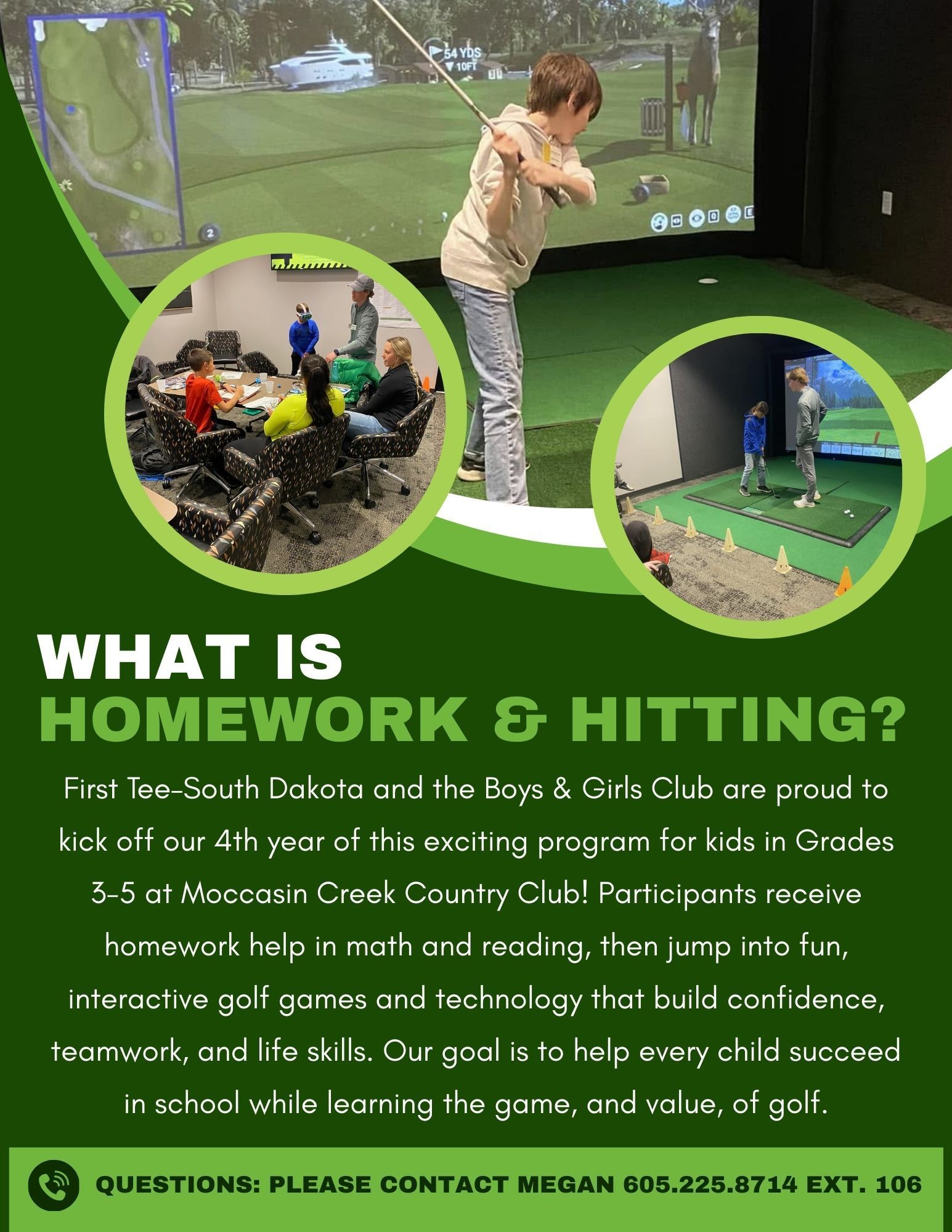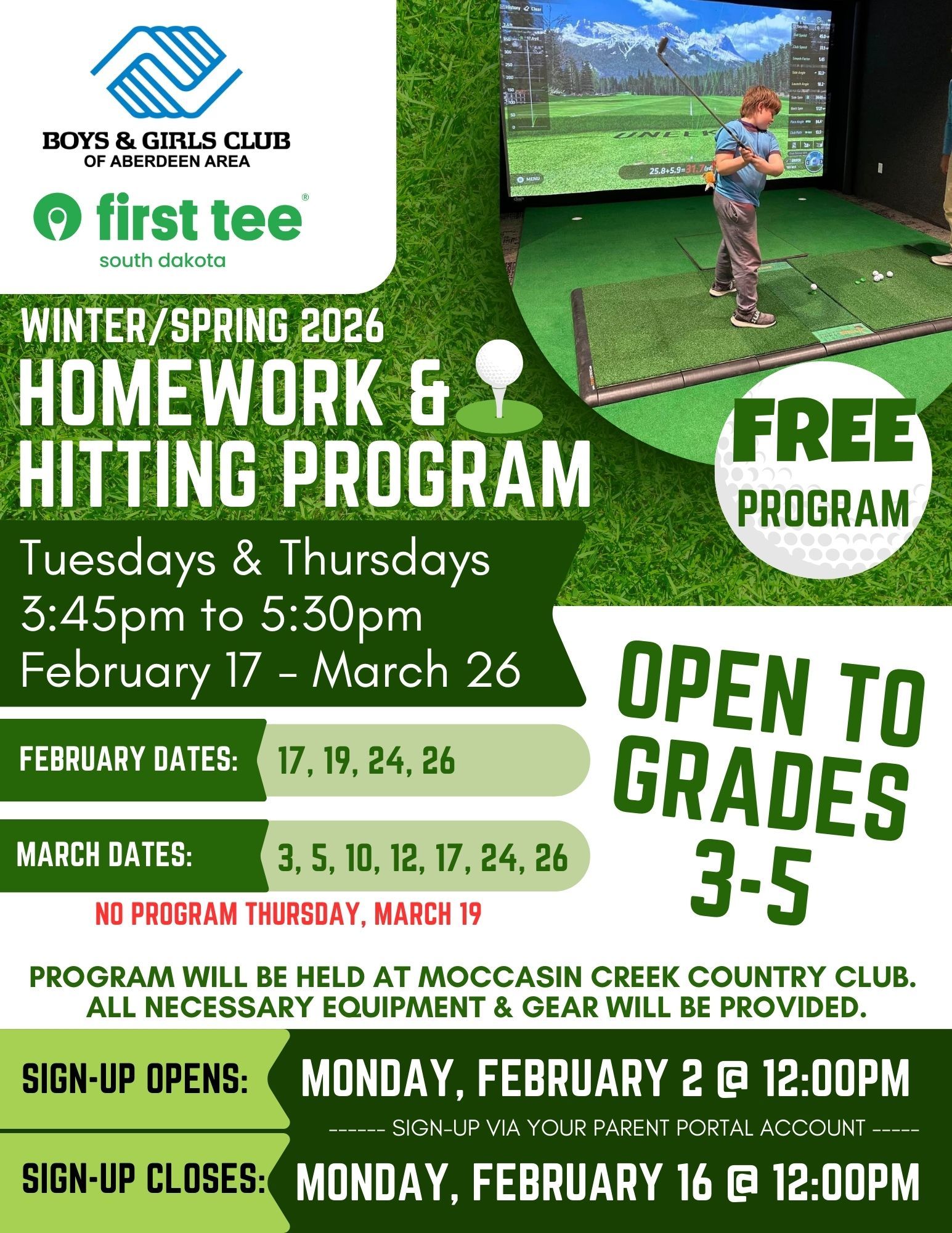 Program is held at Moccasin Creek Country Club, located at 39084 130th Street Aberdeen, SD 57401. Club members will be transported to & from the Country Club by Club staff in Club vans and supervised by Club staff during the program! Program is led by First Tee of South Dakota & Moccasin Creek Country Club and is offered FREE to our Boys & Girls Club members in Grades 3-5. All necessary equipment & gear is provided. Sign-up is for the entire 11 sessions of the program and NOT a week-by-week basis.