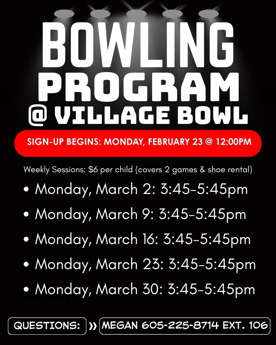 - $6 per weekly session per child (includes 2 games + shoe rental)