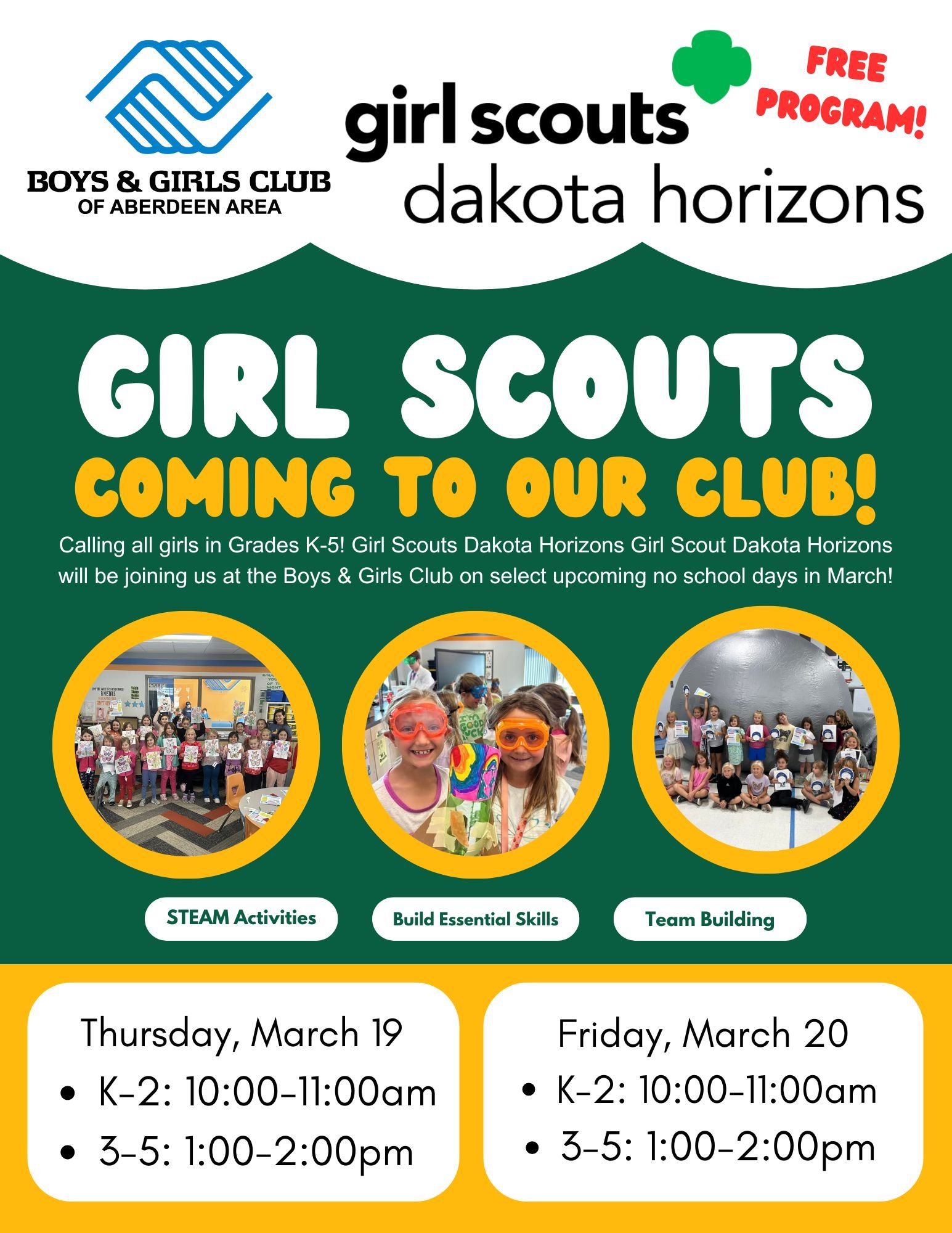 We are excited to welcome Girl Scouts Dakota Horizons to the Boys & Girls Club of Aberdeen Area this week! Calling all girls in Grades K–5! Join us on the upcoming No School Days, March 19 & March 20, for this FREE program filled with STEAM activities, skill-building, and team-building fun.