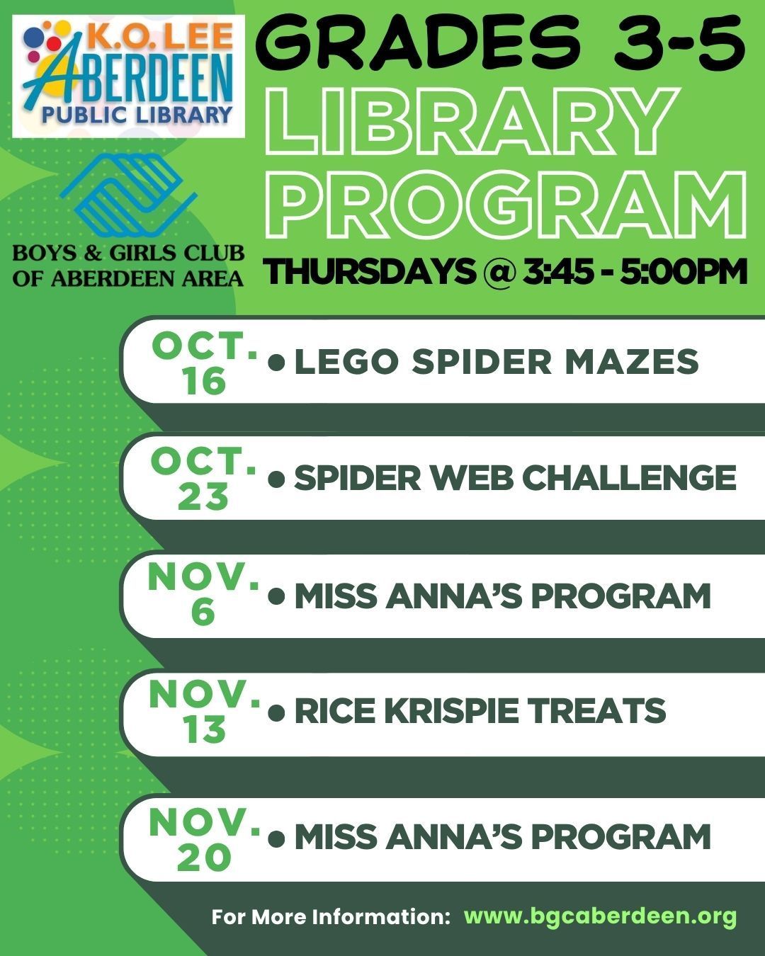 Grades 3rd, 4th & 5th: Oct. 16 - Nov. 20