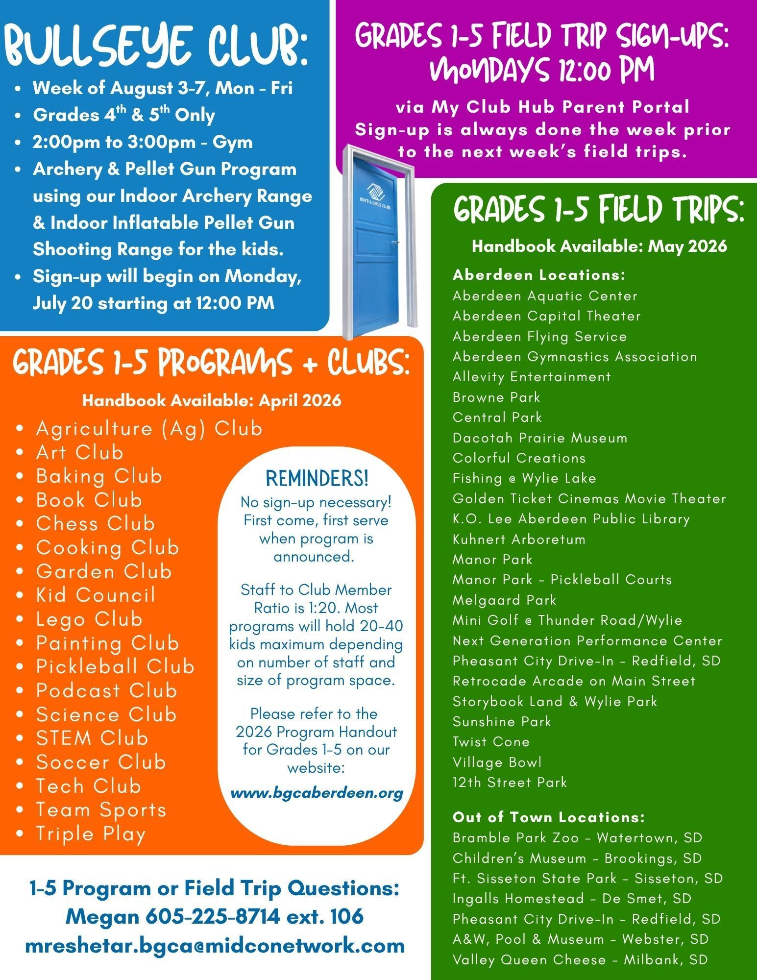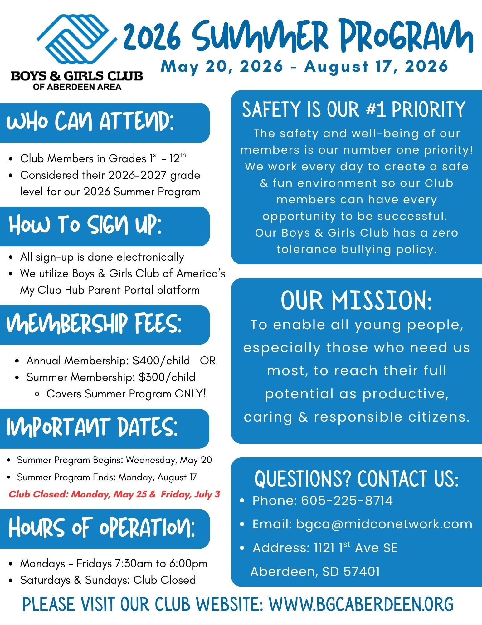 The Boys & Girls Club of Aberdeen Area follows the Aberdeen Public School District's yearly calendar. If your child attends a non-public school, please be aware of our hours of operation and closures.
