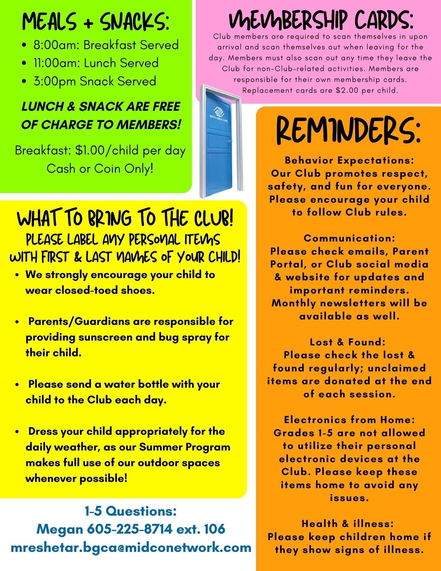 Lunch & Snack are served by grade level. Announcements will be made via our intercom system & by Club staff in each room when meals/snacks and grades are called.