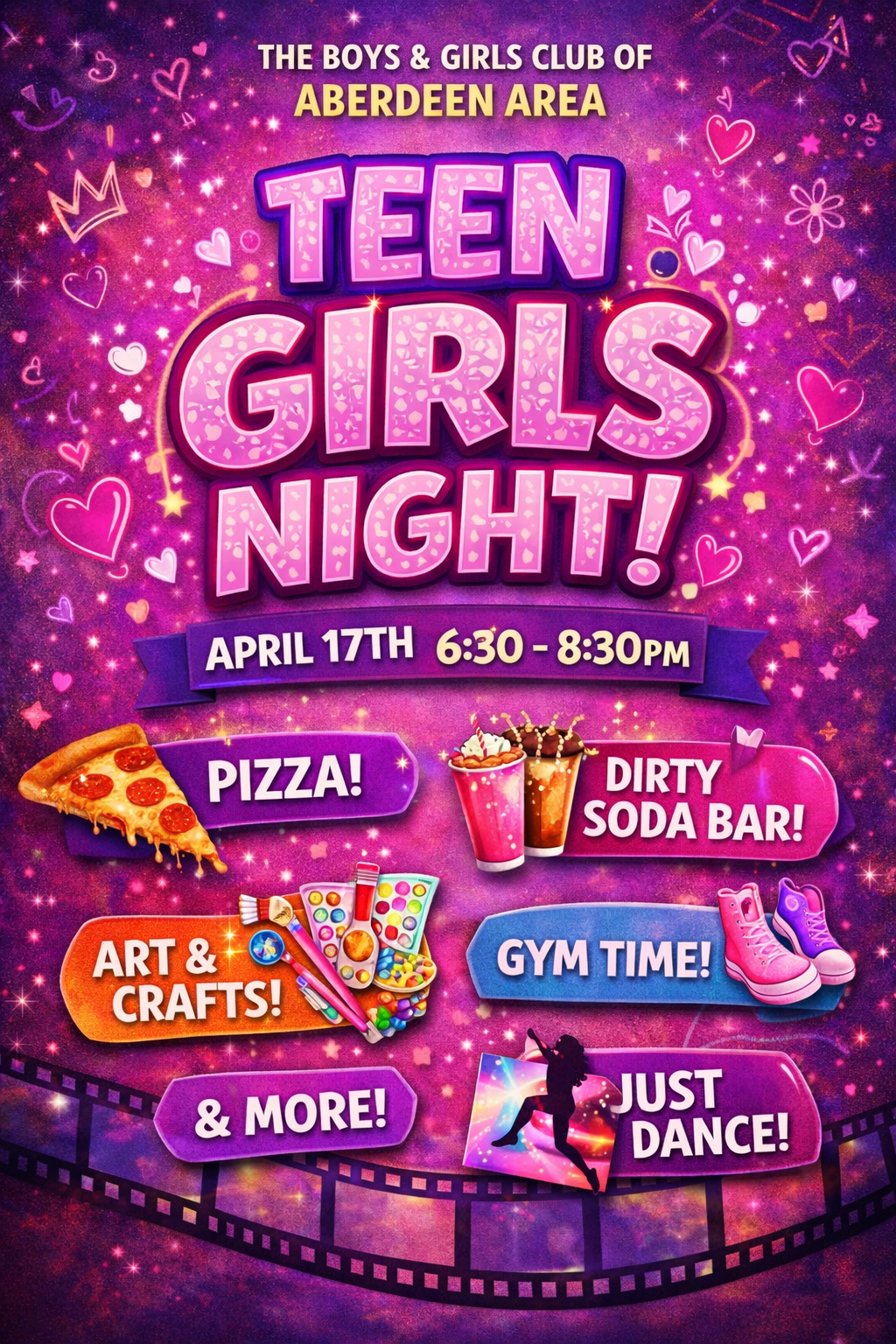 *6th–12th grade GIRLS — join us at the Boys & Girls Club of Aberdeen Area on Friday, April 17th from 6:30pm–8:30pm for a fun night with friends!