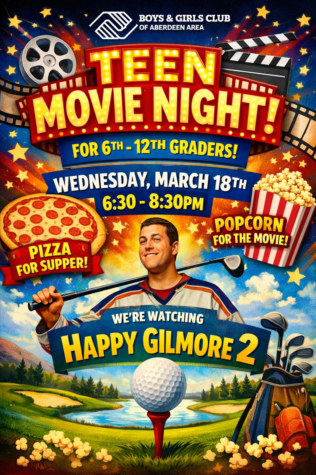 6th–12th graders — join us at the Boys & Girls Club of Aberdeen Area on Wednesday, March 18th from 6:30pm–8:30pm for a fun night with friends!